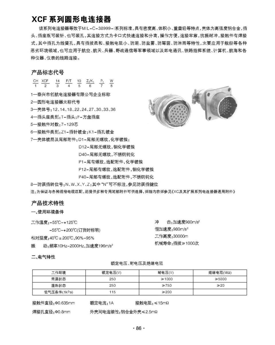 該系列電連接器等效于MIL-C-38999-1系列標(biāo)準(zhǔn),具有密度高、體積小、重量輕等特點(diǎn),殼體為高強(qiáng)度鋁合金,插頭、插座既可裝針、也可裝孔,其連接方式為卡口式快速連接和分離,操作方便,連接牢靠,抗振耐沖,接觸件有焊接式,其中插孔為線簧孔,具有插拔柔和、接觸電阻小、防潮、防鹽霧、防霉菌、防淋雨等特性,主要應(yīng)用于艦船等各種惡劣環(huán)境領(lǐng)域,也可應(yīng)用于航空、航天、兵器、野戰(zhàn)通信等軍事領(lǐng)域以及郵電通訊、鐵路指揮系統(tǒng)、計(jì)算機(jī)、航海和各種儀器、儀表的線路連接