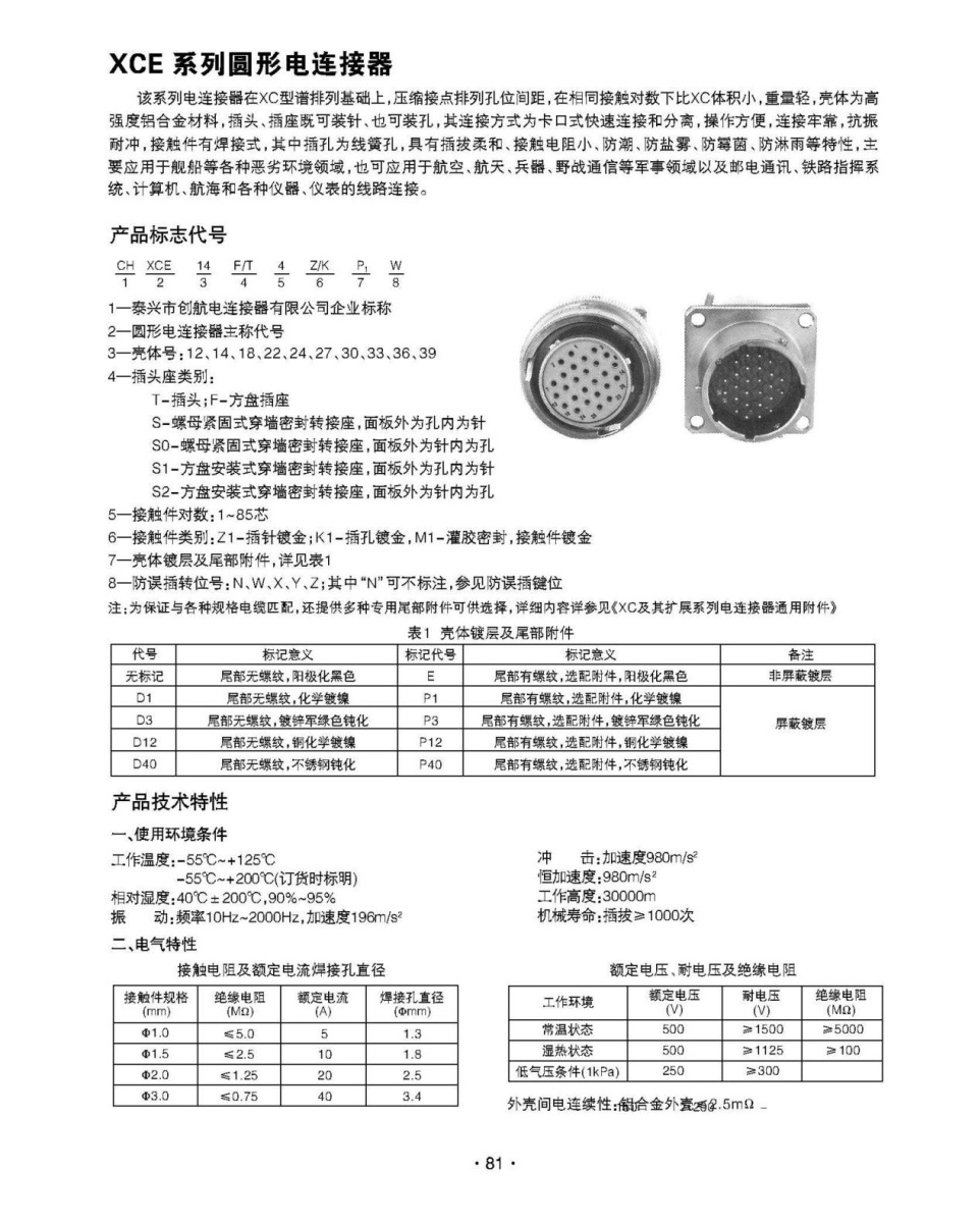該系列電連接器在XC型譜排列基礎(chǔ)上,壓縮接點(diǎn)排列孔位間距,在相同接觸對(duì)數(shù)下比XC體積小,重量輕,殼體為高強(qiáng)度鋁合金材料,插頭,插座既可裝針、也可裝孔,其連接方式為卡口式快速連接和分離,操作方便,連接牢靠,抗振耐沖,接觸件有焊接式,其中插孔為線簧孔,具有插拔柔和、接觸電阻小、防潮、防鹽霧、防霉菌、防雨淋等特性,主要應(yīng)用于艦船等各種惡劣環(huán)境領(lǐng)域,也可應(yīng)用于航空、航天、兵器、野戰(zhàn)通信等軍事領(lǐng)域以及郵電通訊、鐵路指揮系統(tǒng)、計(jì)算機(jī)、航海和各種儀器、儀表的線路連接